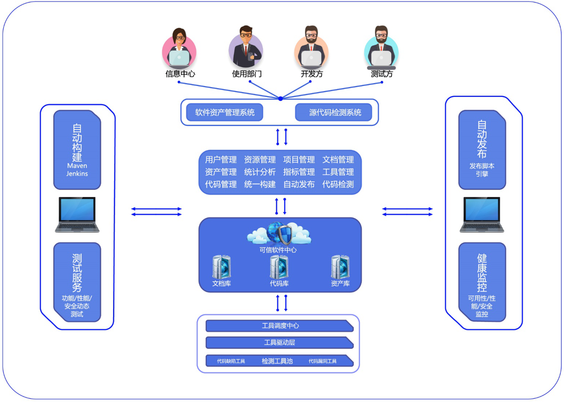 建立软件从源代码检测到发布的闭环流程,保证交付的完整性、部署的一致性、系统运行的安全性和可靠性,从源头杜绝以前代码更新发布的随意性。同时通过平台,能够对招标、建设等多个环节产生信息化系统进行文件粒度的掌控,在更新升级的过程中,也能进行增量检测。为无形资产审计提供保障。